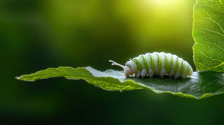 A captivating close-up photograph of a green caterpillar resting on a leaf, surrounded by soft natural light, capturing the essence of nature's beauty.
