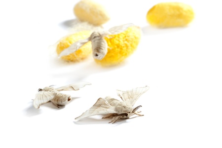 butterfiles of silk worm and yellow cocoon over white background