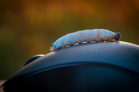 The big white worm on computer mouse background nature morning.