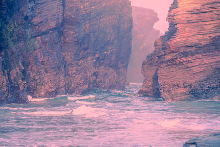 Seascape in the morning. Rocky sea coast at sunrise. Beach Playa de Las Catedrales in Ribadeo, Galicia, Spain, Europe
