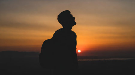 Silhouette of young man against beautiful sunset sky, anonymous person looking down, concept of sadness, loneliness, mental health issues or thoughtful introspection