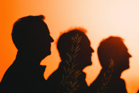 Three friends silhouetted against a vibrant sunset create a tranquil atmosphere in a urban setting. This image captures the beauty of companionship and the joy of shared moments.