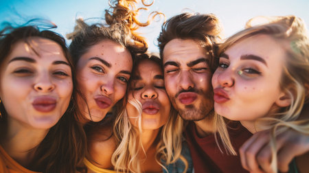 Generative AI : Selfieportrait of funny couple in summer park Friends having fun laughing together People and technology concept