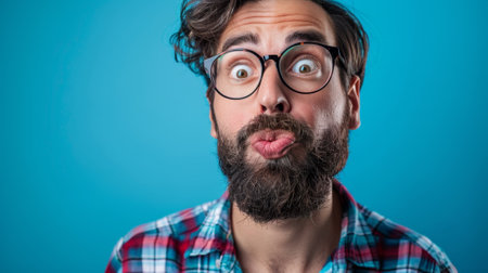 Cool bearded man with long hair sticking his tongue out and looking at camera against blue wall.
