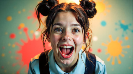 A girl displays a joyful and lively expression, wearing a playful hairstyle and bright makeup. The colorful backdrop features splashes of paint, enhancing her energetic mood.