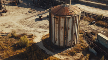 Captivating image showcasing a dusty industrial environment with abandoned structures and grain silos under a clear blue sky, reflecting rural decay and agricultural themes.