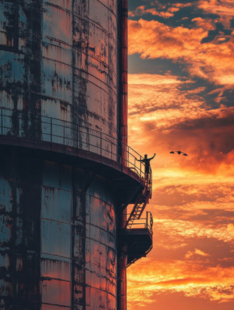 Giant gas storage tanks rise into a vibrant orange sky during sunset, with a figure standing on a staircase admiring the view.