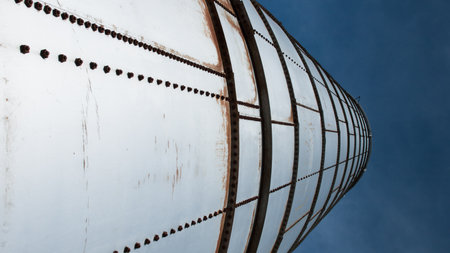 A pair of large industrial storage tanks featuring weathered metal surfaces against a clear sky. Ideal for backgrounds and industrial themes.