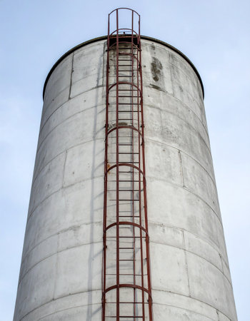 A low-angle view captures the imposing height of a concrete industrial silo. A red ladder stretches vertically towards the top, offering a path of ascent and representing concepts of progress, ambition, and overcoming challenges to reach a new perspective.