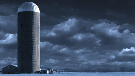 A tranquil view of a tall silo standing alone in a desaturated blue landscape. The sky is filled with dramatic clouds, creating a serene atmosphere.