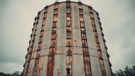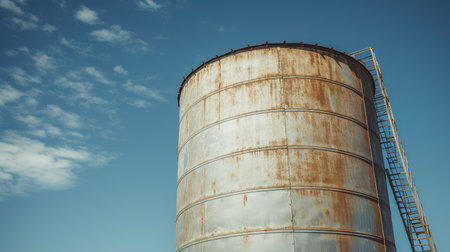 A tall, cylindrical tower, covered in rust and weathering, stands tall against a cloudy sky. A metal ladder runs up the side of the tower, leading to an unknown destination.