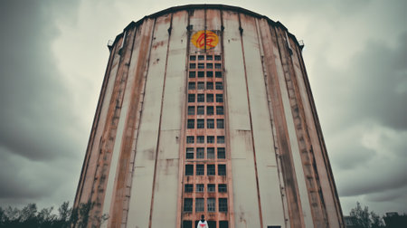 Decaying silo surrounded by overgrown grass, echoes of past industry