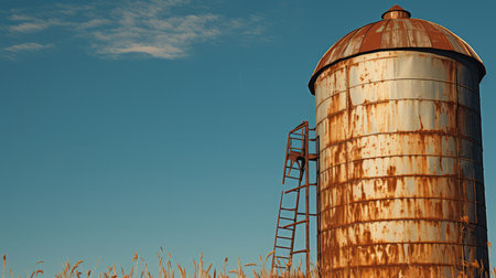 grain silo with corrugated metal. Against a blue sky and brown grass.