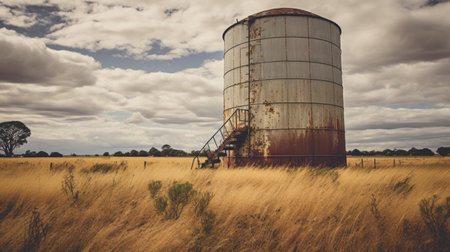 A striking image of metal silos rising above golden grasses under a dramatic, cloud-filled sky, capturing the essence of rural industry and nature's beauty.