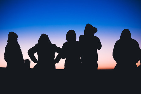People standing behind a trunk and are listening Silhouette sunset blur for background.