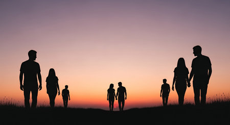 Diverse Group of People Silhouetted Against a Vibrant Sunset, Symbolizing Togetherness and Unity