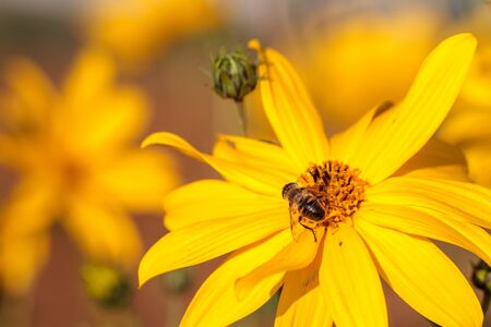 Bee on yellow flower in the garden. Shallow depth of field.