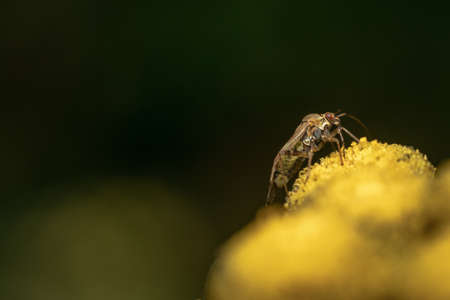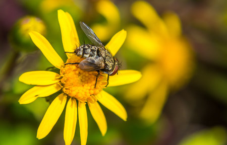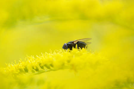 A fly on a yellow flower in the garden. Macro photography.