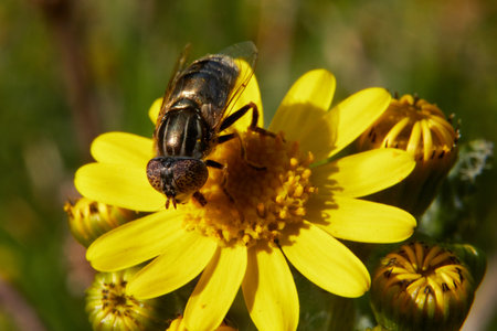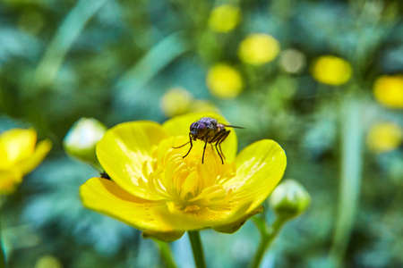 Common green bottle or green blow fly (Lucilia caesar) feeds on pollen and and nectar of yellow flower with green meadow background