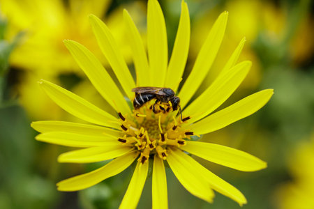 A female Large-headed Resin Bee, Heriades truncorum on a yellow flower in the garden