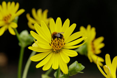 Close-up of a bee on a leopard's bane flower- doronicum -The backgroung is green and out of focus