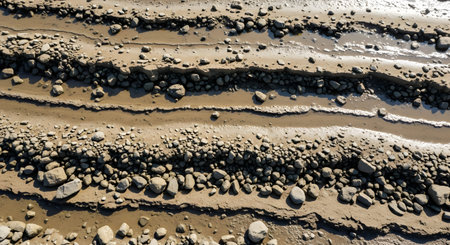 A textured view of muddy ground marked by deep ridges or tire tracks, interspersed with numerous grey stones and pebbles. The wet, uneven surface suggests a construction site, riverbed, or unpaved road after rain.