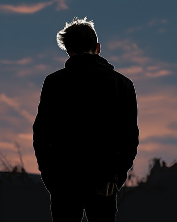 Silhouette of young man against beautiful sunset sky, anonymous person looking down, concept of sadness, loneliness, mental health issues or thoughtful introspection
