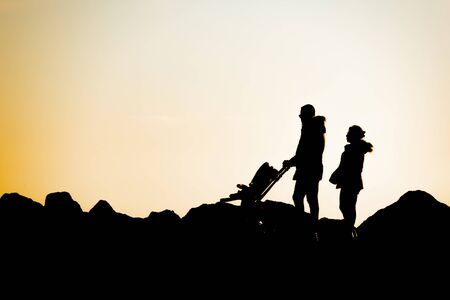 Silhouette of a group of people on the sunset background.