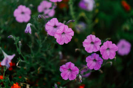 Summer violet garden flowers closeup, beautiful blossom floral card