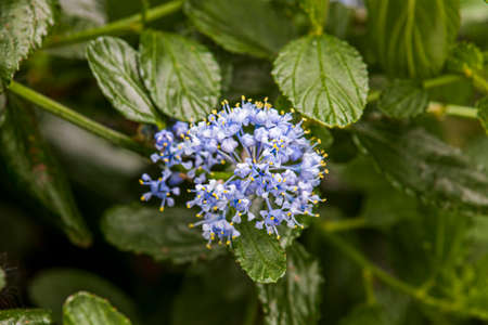 pacific blue ceanothus tree with blue flowers outdoor in sunny backyard shot at shallow depth of field with telephoto lens