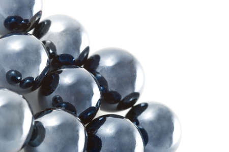 A close up of a bunch of shiny silver balls. The balls are all the same size and are arranged in a pattern