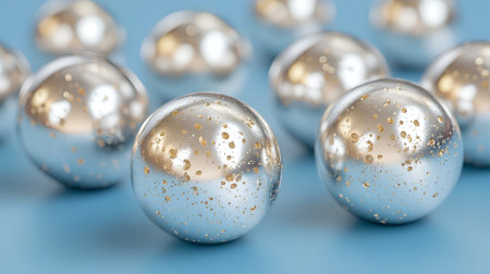 Metallic spheres and golden particles create a mesmerizing pattern, reflecting light in an elegant display.