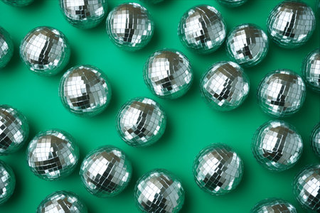 Many small, reflective disco balls forming a glittering background, reflecting light and creating a vibrant, shiny pattern for celebration and party concepts