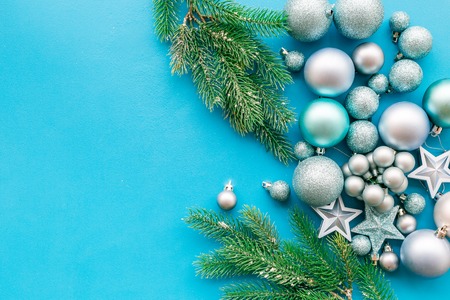 New Year and Christmas atmosphere. Decorate festive christmas tree. Christmas tree decoration. Colorful balls and stars near spruce branch, pine fir on blue background top view copy space