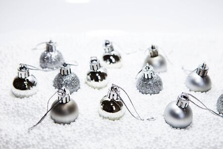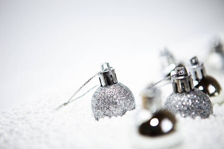 Sparkling Christmas ornaments Christmas balls on a snowy background. Copy space.