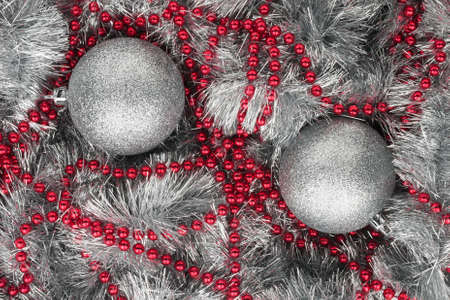 Christmas tree toys on a white background. Christmas decorations on a white surface. Balls and garland of red and silver colors on the table.