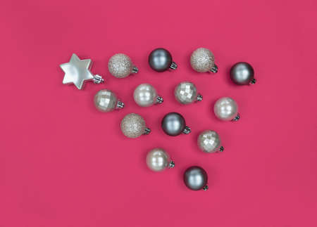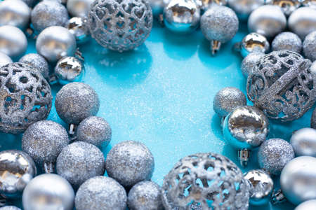 Frame made of Christmas baubles on a silver shiny background. Glittering festive composition with copy space.