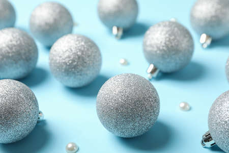 Silver glitter and shiny baubles on a pastel blue background with shadows. New Year creative pattern.