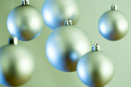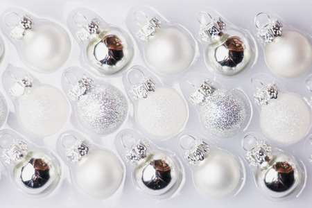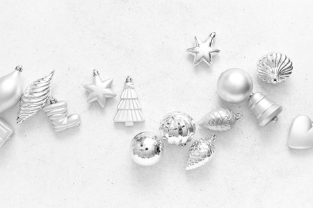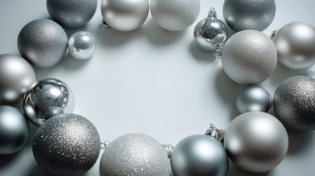 Elegant silver and white Christmas ornaments arranged in circular pattern, creating festive and cheerful atmosphere. Perfect for holiday decorations and celebrations
