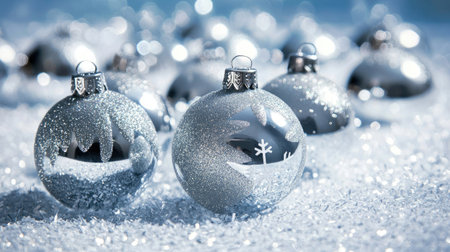 A close-up view of elegant silver holiday ornaments resting on a sparkling snowy surface, creating a magical winter atmosphere perfect for seasonal celebrations.