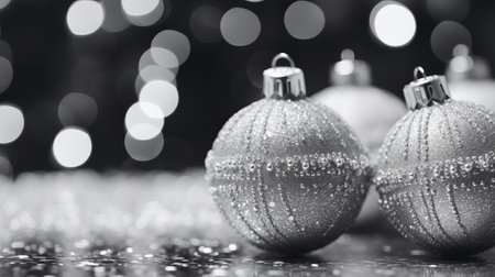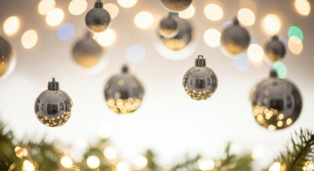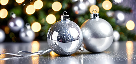 christmas concept with silver ornaments and festive bokeh lights on a reflective surface