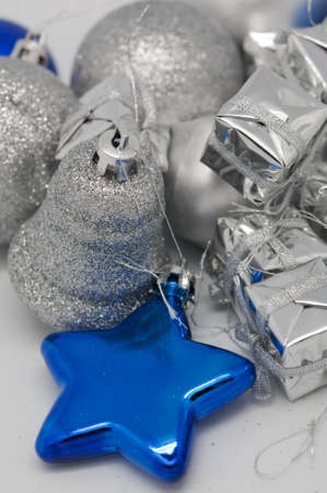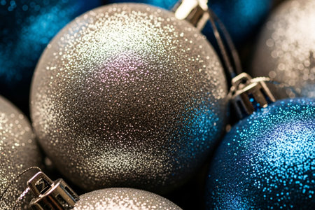 Close-up of shiny blue and silver glitter baubles used as Christmas tree decorations, showcasing festive holiday texture and seasonal elegance for design projects