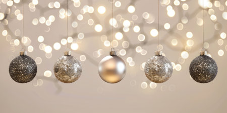 A close-up shot captures multiple shimmering Christmas ornaments suspended in the air. Soft, blurry fairy lights form a bokeh effect in the background, evoking a warm and celebratory holiday mood perfect for seasonal decorations.