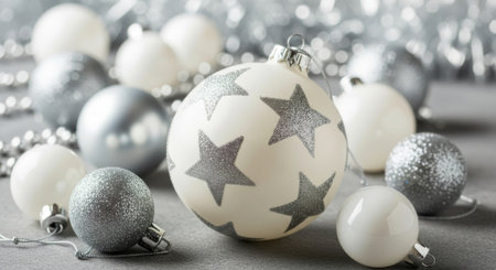 A close-up of festive Christmas decorations featuring a large white bauble with silver stars surrounded by smaller silver and white ornaments on a shimmering background.