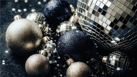 A close-up shot of a disco ball and various Christmas ornaments, creating a festive and celebratory atmosphere.