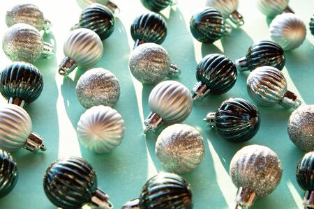 New Year's balls on a minty background. Trendy color year. Christmas and New Year's Day festive decoration. Flat lay.
