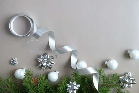Christmas decorations - silver decorative balls, toys on green branches. Holiday background.