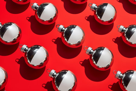 Elegant silver ornaments displayed in a detailed overhead shot, contrasting beautifully with a rich red background, ideal for holiday themes