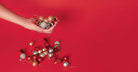 Woman's hand holding decoration balls. Minimal horizontal composition on red background, Christmas or New Year decorative concept with copy space