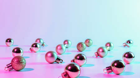 Christmas balls neon winter background. Xmas bauble on abstract holiday gradient backdrop. Happy new year copy space
